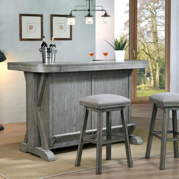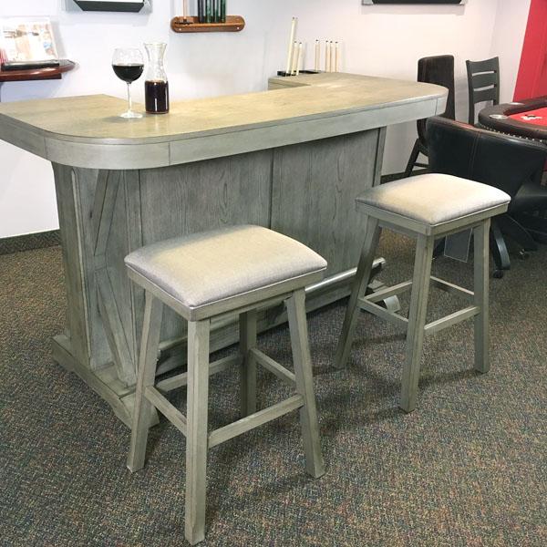 Tabouret de bar Graystone au fini gris de style bois de chêne agé. Conçu pour utiliser seul ou avec le meuble de bar et accessoires Graystone au même fini. Meuble de bar, autres tabourets et accessoires vendus séparément.