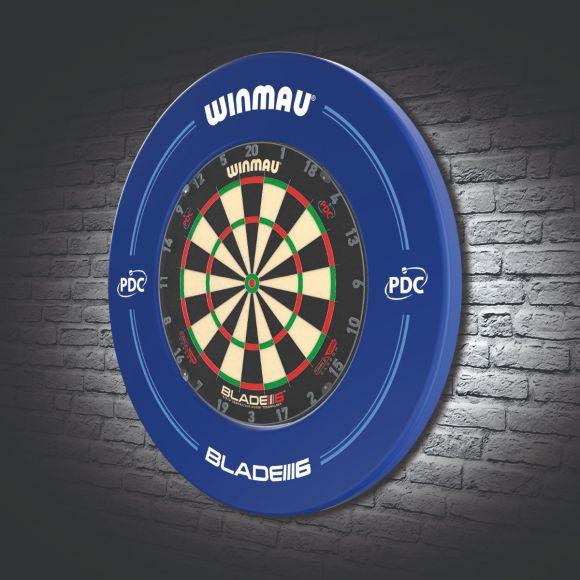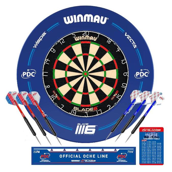 Ensemble de cible, fléchettes, contour de cible et ligne de tir Winmau Blade 6. Inclut les accessoires suivants ; 1x cible de fléchettes Winmau Blade 6, 1x mousse ambiophonique de contour en PDC Bleue Winmau, 1x ligne officielle Oche PDC, 1x carte de table de caisse et 2x jeux de fléchettes en laiton